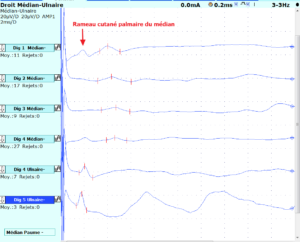 • Stimulation sur le trajet du médian à la paume, recueil sur le médian au poignet à 8 cm de distance (pour limiter l’erreur de mesure au mètre-ruban)